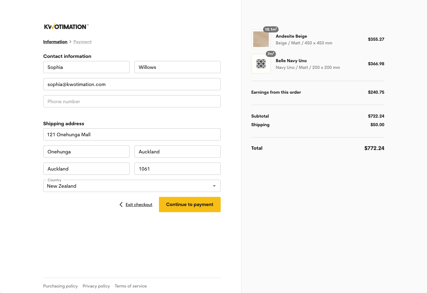 To not confuse our subscribers, we decided that the customer would pay the tiler off platform for the products at the same time they paid the tiler their labor down payment. The tiler would then access an online checkout interface from the interactive kwote where they would purchase the tiles so they could be delivered to the customer.